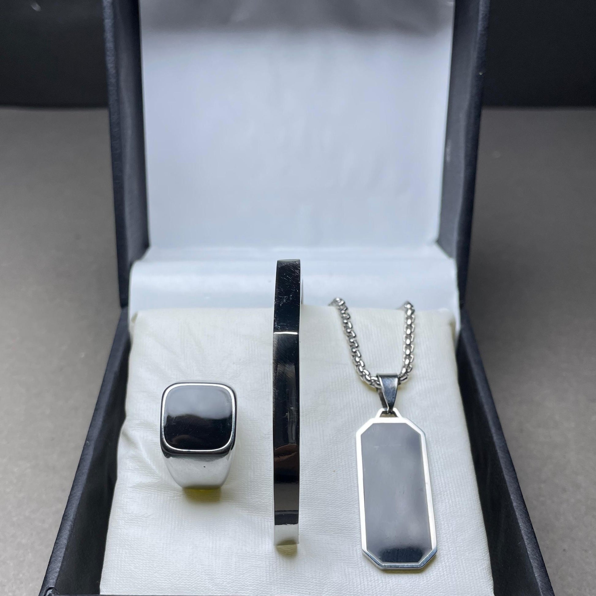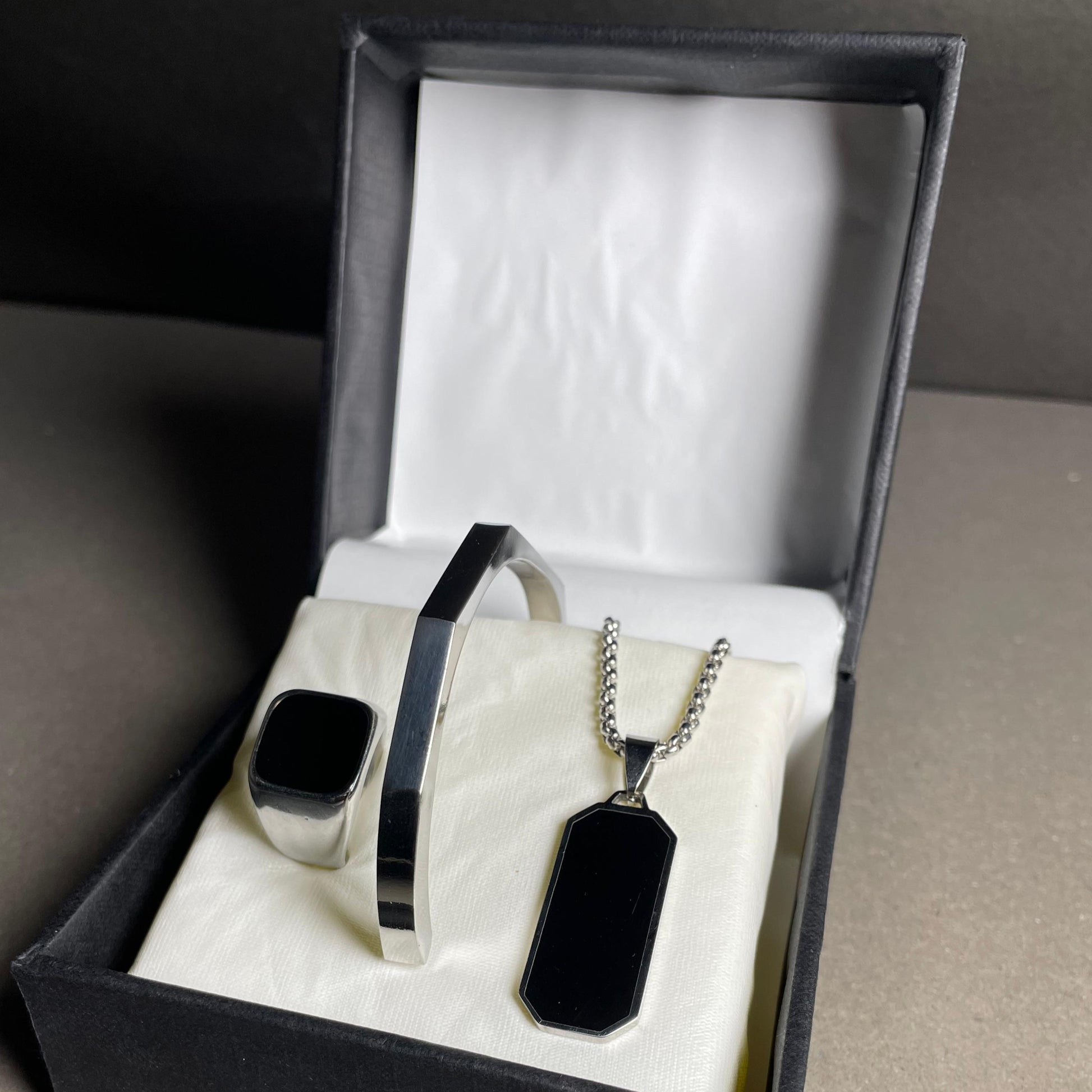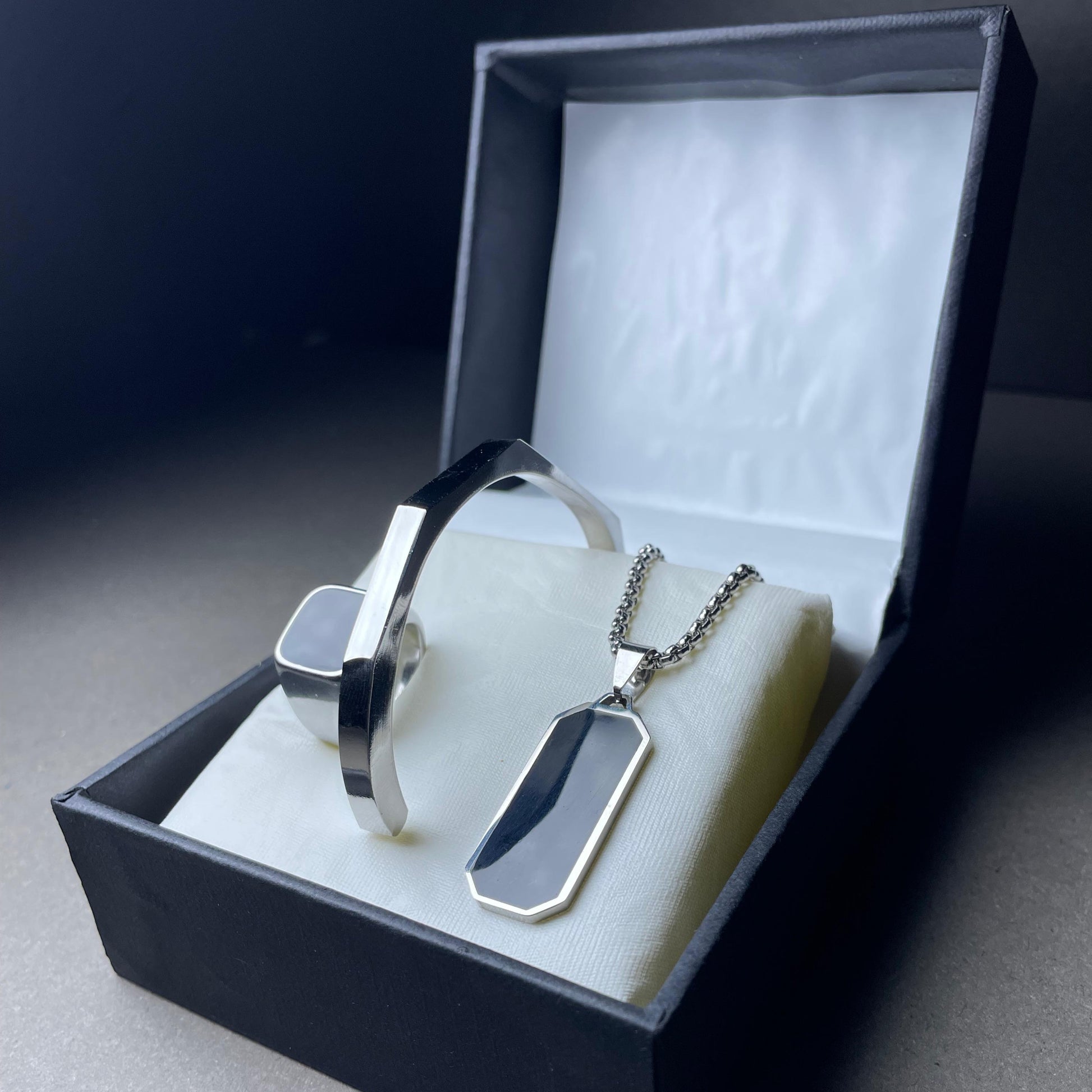 Discover timeless elegance with the Eos Luxe Trio, a curated collection that includes a sophisticated bracelet, pendant necklace, and statement ring. Perfect for any occasion, this luxurious set offers refined simplicity with its polished finish and sleek design. Whether you're treating yourself or gifting a loved one, the Eos Luxe Trio adds a touch of class to any ensemble.